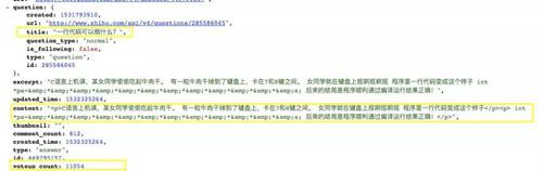 爬下来的内容当中有几个需要注意的字段,下图中用黄框高亮出来了: