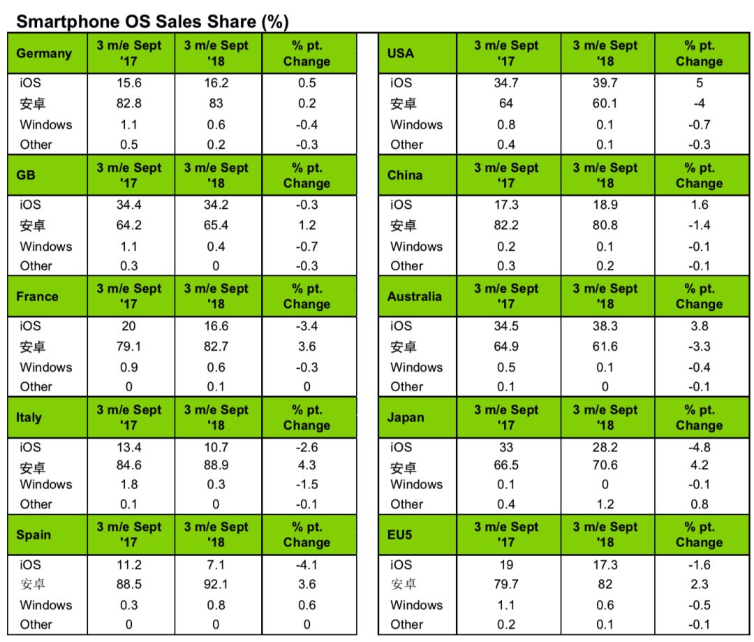 凯度移动通信消费者指数(Kantar Worldpanel ComTech)的最新智能手机操作系统数据显示安卓的情况喜忧参半,在2018年第三季度中,安卓在美国市场与iOS的竞争中处于劣势,但在欧洲五个主要市场却取得了显著增长。