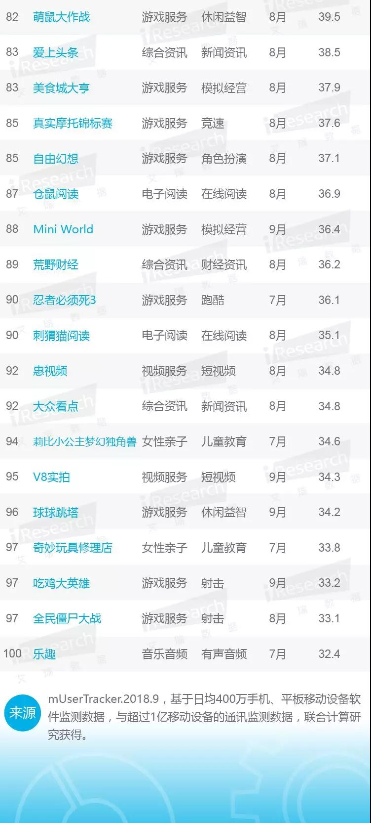 1.行业整体月环比增长不足1%:2018年Q3移动互联网用户规模环比Q2末仅增长2700万台,月环比增速收窄至1%以内。至9月底,移动互联网月独立设备数达到13.3亿台,中国移动互联网用户总量趋于饱和。