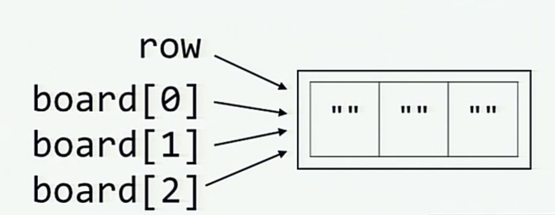 而当通过对 row 做乘法来初始化 board 时, 内存中的情况则如下图所示 (每个元素 board[0], board[1] 和 board[2] 都和 row 一样引用了同一列表。)