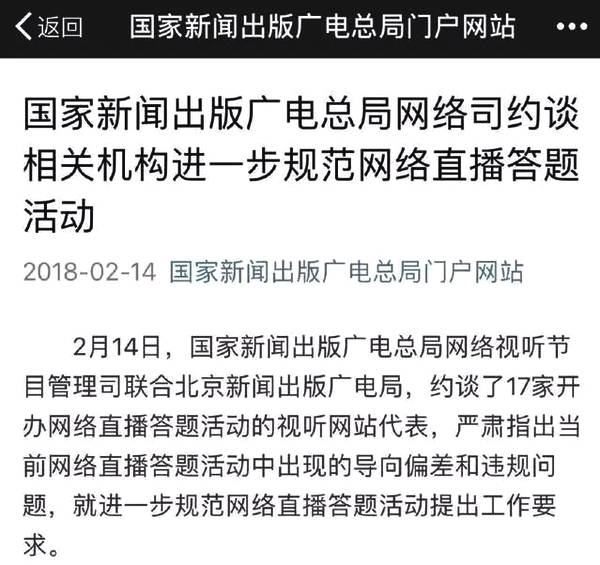 2 月 14 日,广电总局发布声明,要求对网络视听直播答题活动加强管理,并规定未持有《信息网络传播视听节目许可证》的任何机构和个人,一律不得开办网络直播答题节目。