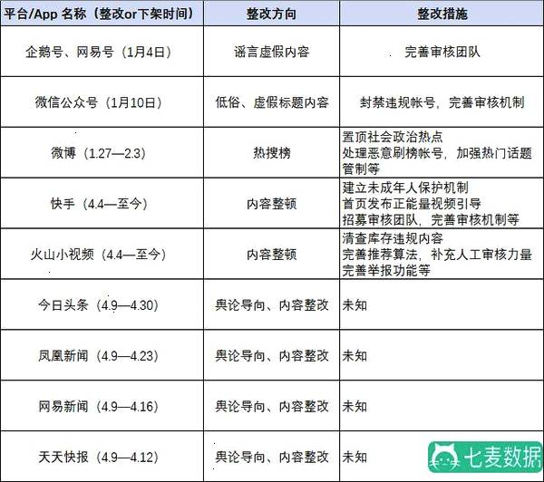 4 月 9 日,【今日头条】、【凤凰新闻】、【网易新闻】、【天天快报】被约谈下架,随后,运营六年的“内涵段子”被勒令永久关停。