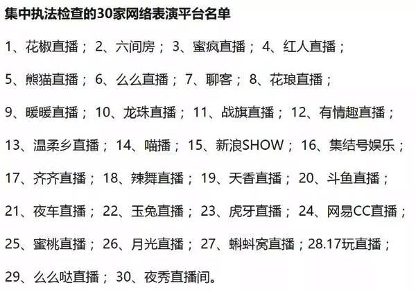 4 月 17 日,文化和旅游部再次组织对 30 家直播平台进行执法排查,【斗鱼直播】、【虎牙直播】等知名直播平台也未能幸免。