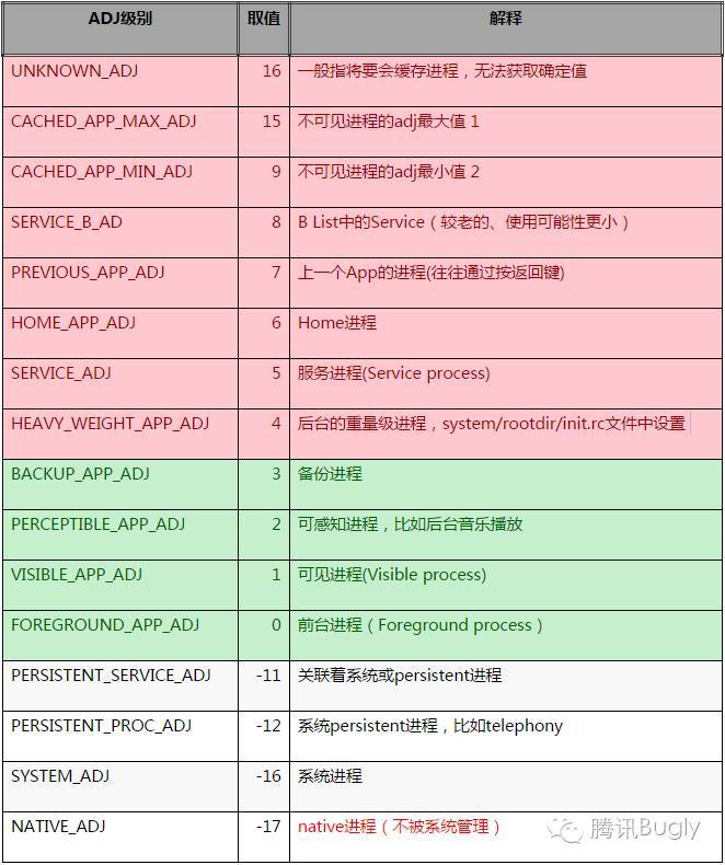 其中红色部分代表比较容易被杀死的 Android 进程(OOM_ADJ>=4),绿色部分表示不容易被杀死的 Android 进程,其他表示非 Android 进程(纯 Linux 进程)。在 Lowmemorykiller 回收内存时会根据进程的级别优先杀死 OOM_ADJ 比较大的进程,对于优先级相同的进程则进一步受到进程所占内存和进程存活时间的影响。