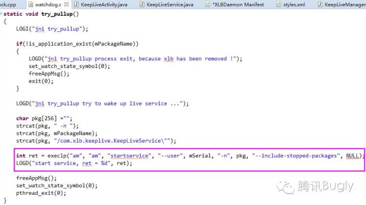 通过 Native 进程拉活主进程的部分代码如下,即通过 am 命令进行拉活。通过指定“—include-stopped-packages”参数来拉活主进程处于 forestop 状态的情况。