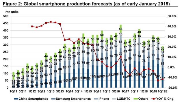 但显然,感受到智能手机市场需求低迷之痛的不仅仅是苹果公司。今日,瑞士信贷分析师在一份报告中调低了对2018年第四季度和2019年第一季度的全球智能手机产量预期。