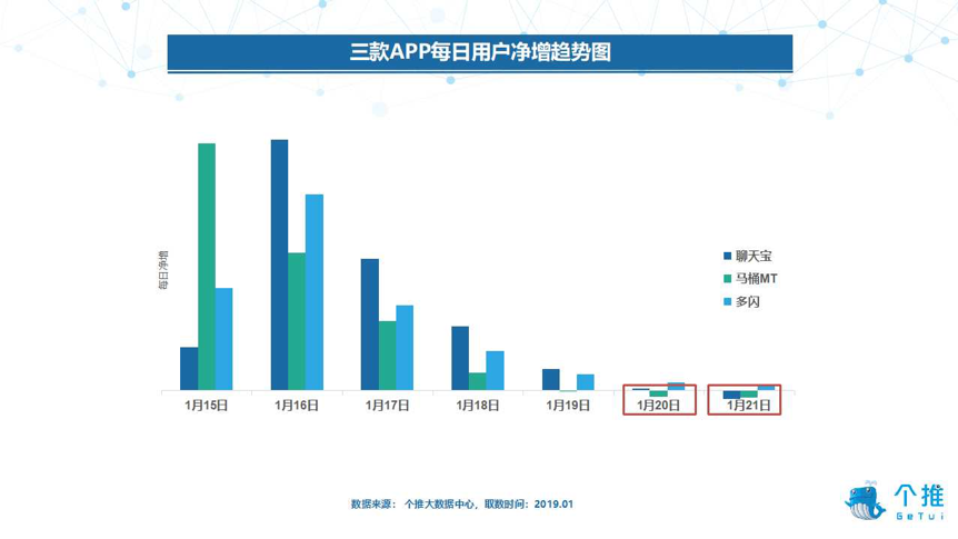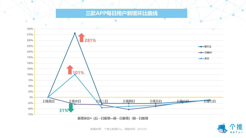 据个推大数据统计结果显示,在三款产品发布日当天,马桶MT和多闪的净增长达到100%,而聊天宝增长相对慢一些,在1月16日才达到高峰,这也跟聊天宝最晚发布有关。