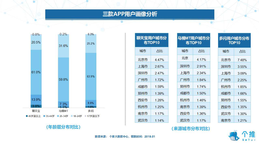 个推大数据通过对三款APP进行数据分析,发现它们的用户特征较为相似。三款APP用户以男性为主,25-34岁之间的85后职业群体较多,而且主要分布在北上广深等一线城市。