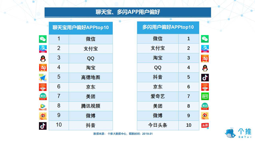 据个推大数据的统计结果显示,聊天宝和多闪在用户使用APP偏好上略有差异。两个APP用户使用偏好差异主要体现在,排名前10的APP中多闪用户使用抖音的较多,同时今日头条也排进前10。可见在多闪用户增长方面,同属头条系的抖音和今日头条在导流上发挥了很大作用。而且抖音已经跟多闪实现账号打通,在抖音上也可查看用户随拍视频。