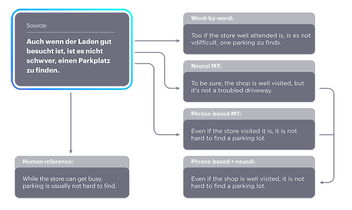 § 对于德语-英语任务,基于神经和短语的翻译模型组合得到BLEU得分为25.2(高出基线10个BLEU点)。