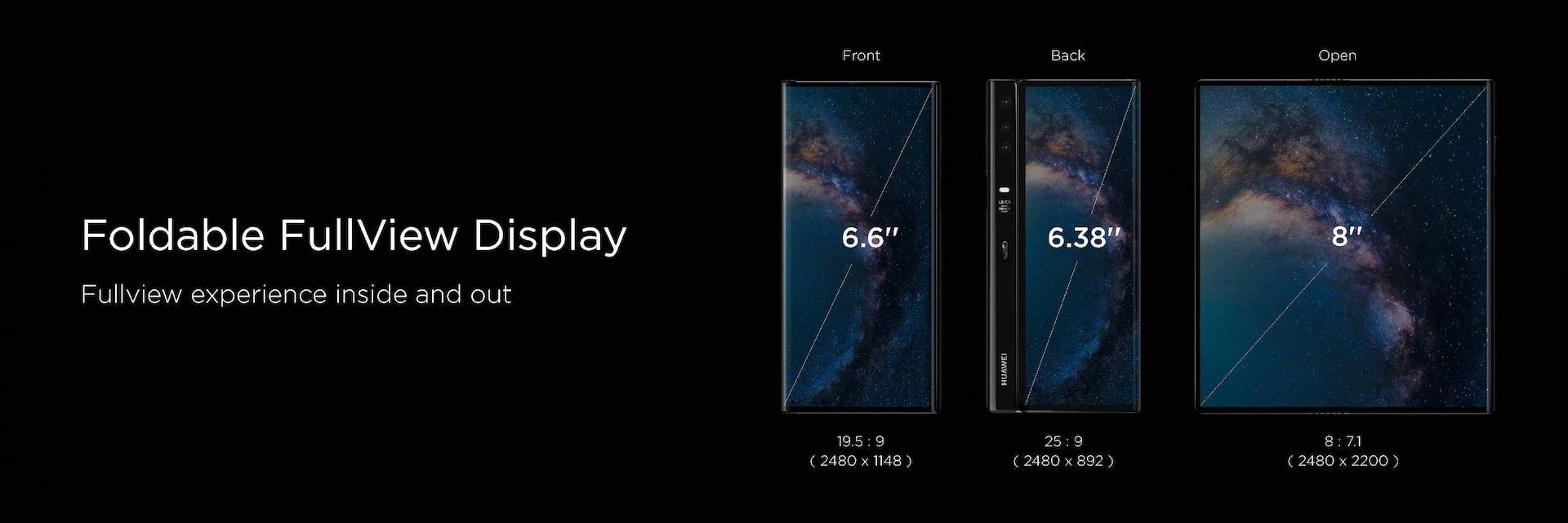 Mate X 正面屏幕6.6 英寸,19.5:9 比例2480x1148 分辨率;背面屏幕6.38 英寸,25:9 比例2480x892 分辨率。展开后是一块8英寸大屏,8:7.1 比例2480x2200 分辨率。
