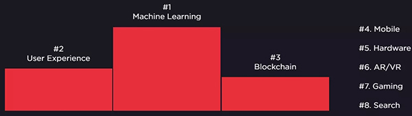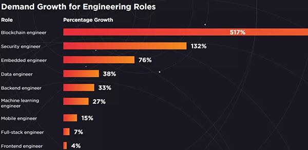 Hired市场的数据显示,全球对区块链工程师的需求正在飙升,同比增长517%。对于精通区块链的工程师,他们通常拥有后端工程师、系统工程师或解决方案架构师等经验。此外,安全工程师也非常抢手,这可能是由于数据泄露数量不断增加以及消费者隐私问题日益严重;专注于数据分析和机器学习的人才需求也在不断增长。