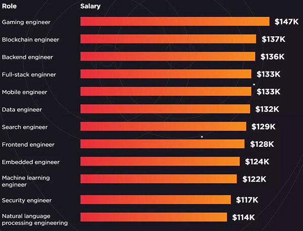 随着需求的增加,薪资也会有所增加,在旧金山,区块链工程师平均薪资15.5万美元,而在伦敦,他们的平均收入为89,000美元。当然不同地方的薪酬标准和竞争格局不同,薪资也会有所不同,以下为纽约工程师的薪资排行: