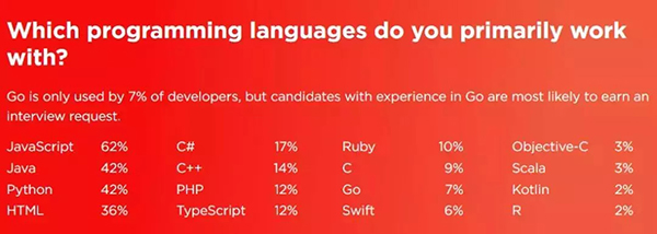 根据数据显示,具有Go编程经验的开发者最受雇主欢迎,但是却只有7%的接受调查的开发者使用Go。JavaScript是最多开发者使用的编程语言,占据了62%,除此之外,还有12%使用TypeScript。