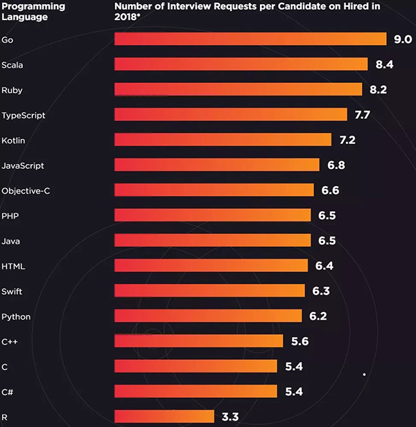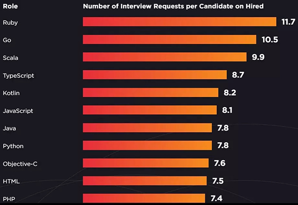 下图显示的是 2018 年每种语言下每个职位候选人面试申请的次数: