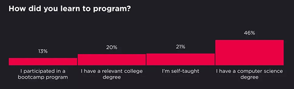 学习编程并不是一件简单的事,你需要花数年的时间来学习,这也是开发这个岗位如此抢手的一大原因,如今已经有五分之一的开发者是自学成才,还有46%的开发者通过传统教育途径,取得CS学位,掌握编程技能