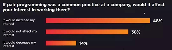 根据开发者们的说法:团队合作能使梦想成真。调查数据显示,软件工程师对结对编程感兴趣,这是一种开发方式,两个程序员在一个计算机上一起工作,事实上,48% 的人表示,结对编程会增加他们在公司工作的兴趣。