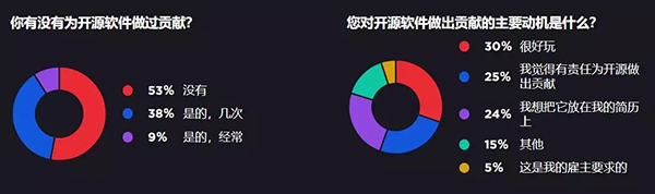 30%的开发人员表示他们为开源做贡献,因为它很有趣。但只有9%的开发者经常参与开源,高达53%的开发者表示从未参与过开源