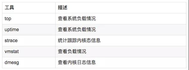//查看负载情况 uptime top vmstat //统计系统调用耗时情况 strace -c -p pid //跟踪指定的系统操作例如epoll_wait strace -T -e epoll_wait -p pid //查看内核日志信息 dmesg