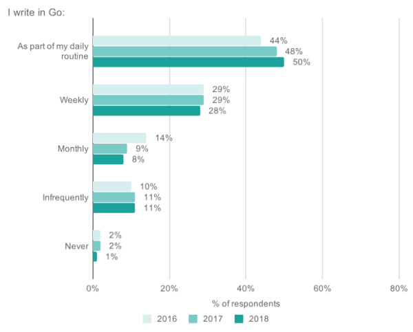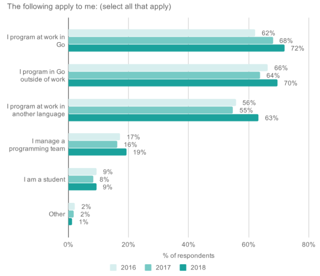 首次有一半的受访者表示 Go 是他们日常使用的编程语言之一。此外,在工作中用到 Go 语言以及在工作之余使用 Go 语言的受访者人数也显著增加。