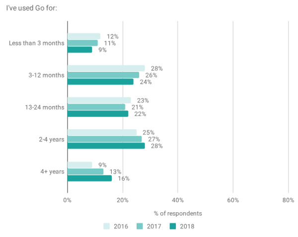 可以看到,受访者普遍都有 2 年以上的 Go 开发经验,且这个比例每年都保持增长,而 Go 新手的比例也在逐年下降(这里新手的定义为使用 Go 语言的时间是 12 个月以内)。所以这就间接表明在入门 Go 语言后,大多数开发者不会选择放弃。