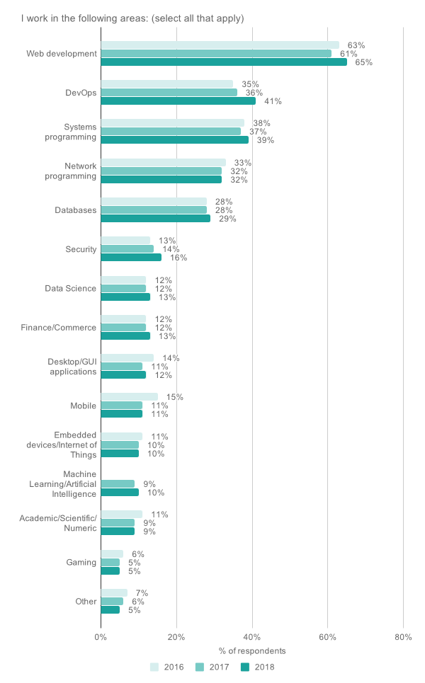 调查结果显示,绝大多数受访者(72%)在 2-5 个不同的开发领域工作。而 Web 开发是最常见的领域,高达 65%,占据主导地位。DevOps 的比例也从 36% 增加到 41%,位居第二名。而系统编程则以 39% 的比例次于 DevOps。