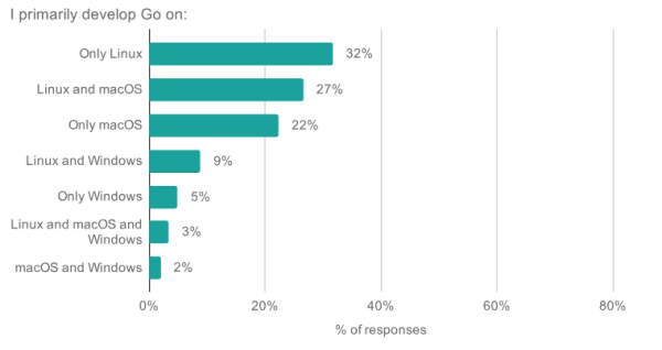许多 Go 开发者的主力开发系统不止一个 —— Linux 和 macOS 尤其受欢迎。大多数受访者表示使用这两者之一或全部来编写 Go 代码。