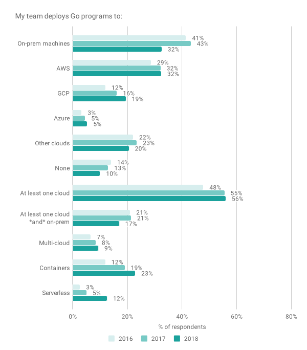 2018 年,将 Go 应用程序部署到本地服务器的受访者比例从 43% 降至 32%,越来越多开发者选择将 Go 应用部署到云上,无服务器和容器也正在变成越来越流行的部署平台。