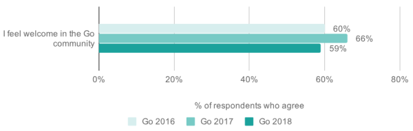 维护社区的健康对开源项目的发展非常重要,所以在过去三年里 Go 团队一直在关注开发者在 Go 社区是否有得到足够的到关注和尊重。本次的调查结果显示,“我在 Go 社区中有被关注的感觉”这一说法的比例,从 66% 下降到了 59%。主要是 Go 新手得不到足够的回应,从而对社区产生了疏远感。被问到如何改进此问题时,官方整理的受访者回答大致可分为: