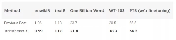 正如你现在可能已经预测到的,Transformer-XL在各种语言建模基准/数据集上取得了最新的技术成果。以下是他们页面上的一个小表格,说明了这一点: