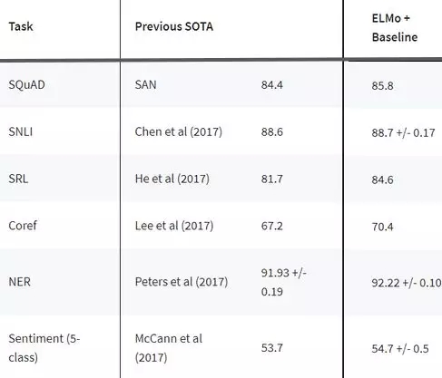 ELMo是一种用向量和嵌入表示单词的新方法。这些ELMo 词嵌入(word embedding)帮助我们在多个NLP任务上实现最先进的结果,如下图所示: