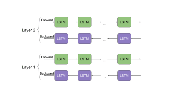 让我们花点时间来了解一下ELMo是如何工作的。回想一下我们之前讨论过的双向语言模型。从这篇文章中我们能够得到提示,“ELMo单词向量是在双层双向语言模型(biLM)的基础上进行计算的。这个biLM模型有两层叠加在一起,每一层都有2个通道——前向通道和后向通道: