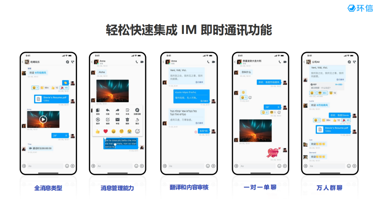 除了稳定性之外,功能性也是企业级IM重要的一部分。环信IM支持即时消息、群组聊天、即时通送、位置共享等多种通讯功能,能够满足企业在不同场景下的通讯需求。无论是日常的工作沟通、团队协作,还是客户咨询、售后服务,环信IM都能提供全方位的支持。