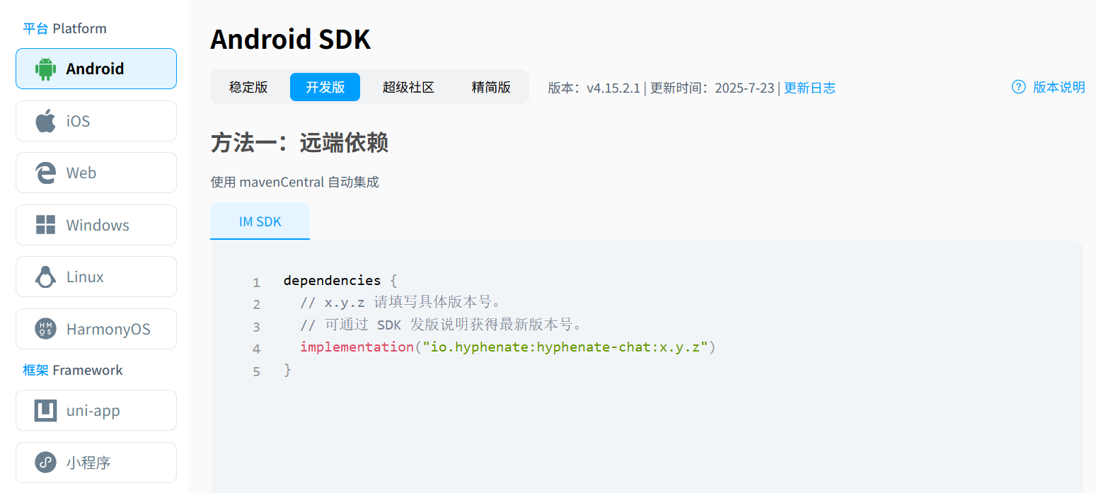 通过提供覆盖全平台的SDK包,以及开箱即用的UIKit组件库,开发者无需从零开始搭建IM框架,只需简单几步即可将即时通讯功能集成到自己的应用中。特别是UIKit组件库,预置了会话列表、聊天界面等通用UI组件,开发者可以直接调用,大幅缩短了开发周期。此外,环信SDK还支持自动化适配多平台、多语言环境,包括Android、iOS、Web、Windows、Linux、HarmonyOS、小程序、uni-app和flutter等,确保了应用在不同设备和操作系统上的兼容性和一致性。