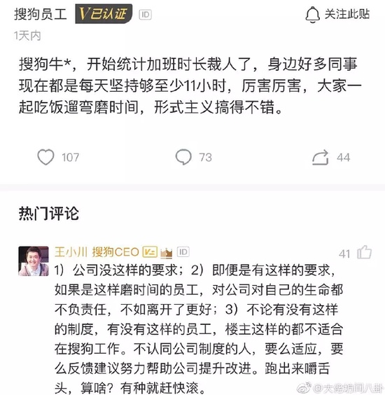 王小川称,即便是有这样的要求,如果是这样磨时间的员工,对公司对自己的生命都不负责任,不如离开了更好。他还表示,不论有没有这样的制度,有没有这样的员工,楼主这样的都不适合在搜狗工作。不认同公司制度的人,要么适应,要么反馈建议努力帮助公司提升改进。