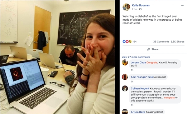 另外,有网友还注意到Bouman在社交网络上分享的一张照片,她写道“难以置信地看着我第一次绘制的黑洞照片正在生成”,所用的电脑是Macbook Pro。