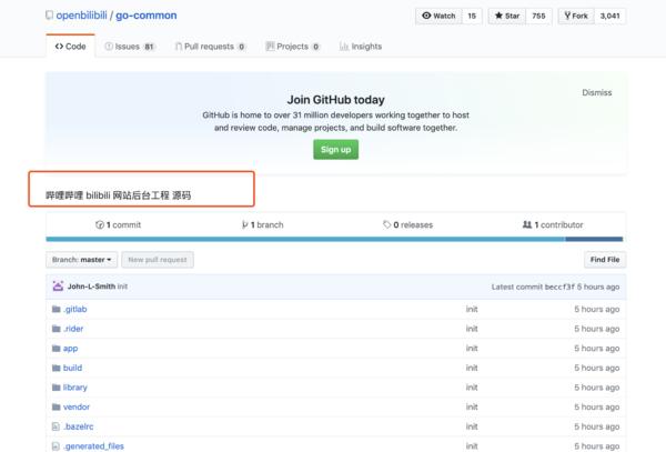 具查验在 GitHub 平台上确实存在一个由用户 openbilibili 创建的 go-common 代码库,项目描述「哔哩哔哩 bilibili 网站后台工程 源码」并获得了 6597 个标星和 6050 个fork,目前该代码库已无法查看。