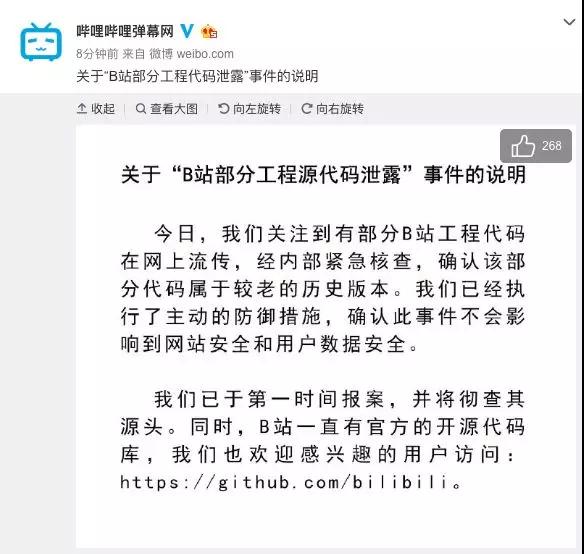 在消息发布后的一个小时,bilibili弹幕网在微博回应代码泄露,“经内部紧急核查,确认该部分代码属于较老的历史版本。”B站表示,已经执行了主动防御措施,确认此事件不会影响网站安全和用户数据安全。B站已第一时间报案,并将彻查源头。