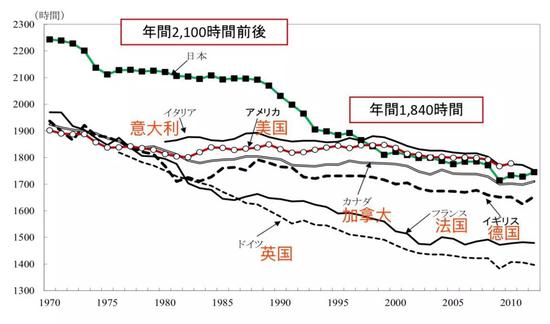 即使到了2010年代,日本劳动者的年工作时长大概是在1700小时左右,也依旧远高于英国、法国、德国这些国家的1400-1500小时。