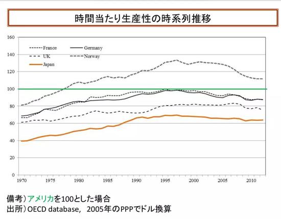 日本单位时间内的劳动生产率仅有法国的50%左右,仅有德国、英国的60%左右。