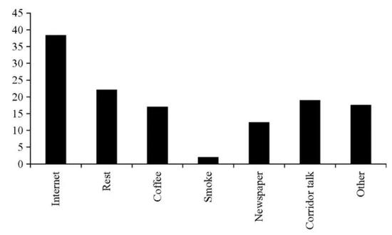其中互联网位居首位,为38分钟。排名第二的是小睡,为21分钟。排名第三的是走廊聊天,大概是20分钟。