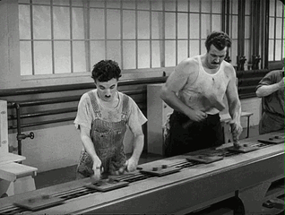 当时生产线上的工人正如卓别林在电影《摩登时代》中表演的一样,每一个动作都如机器人一般机械,八小时内不允许说话、不允许喝水甚至不允许上厕所。
