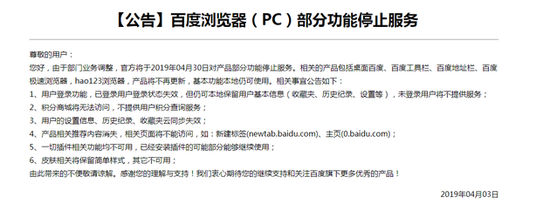 新浪科技讯 4月26日上午消息, 今日,百度浏览器在其官方网站发布公告称,由于部门业务调整,官方将于2019年04月30日对产品部分功能停止服务。