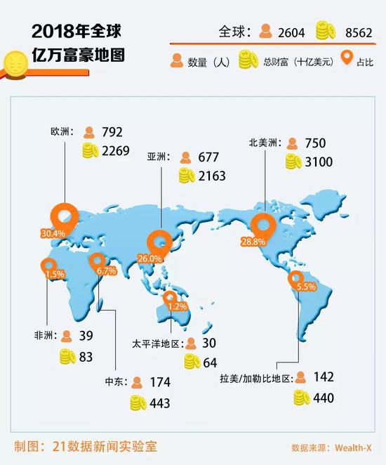 从洲际看,2018年,欧洲依然是亿万富豪最多的地区,为792人,亿万富豪所拥有的总财富为2.27万亿美元。