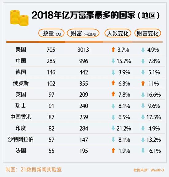 从所属国家或地区看,美国仍然是全球亿万富翁最多的国家,有705位,较2017年减少4.9%,但财富总额增加了3.7%,至3.013万亿美元。