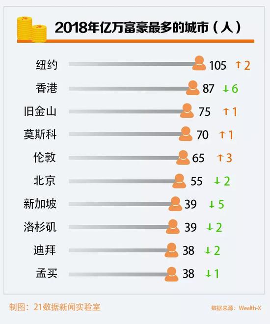 2018年,全球亿万富豪最多的城市是纽约,亿万富豪有105位。第二、第三的是香港、旧金山,人数分别为87位、75位。北京则是位居第6,有55位亿万富豪。