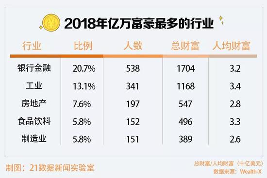 分行业看,银行金融、工业、房地产、食品饮料以及制造业则是造就亿万富翁的前5大产业。这5大行业上榜亿万富翁的人均财富额达到30.6亿美元。