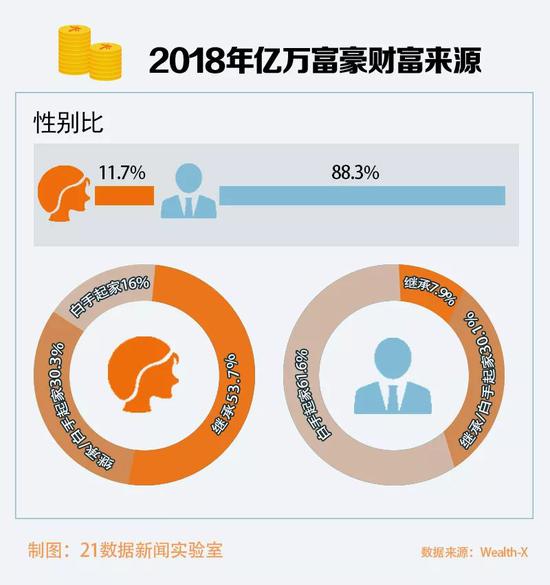 从性别来看,88%的亿万富翁都是男性,其中62%都是靠白手起家;女性亿万富翁占比仅为12%,且财富大多来自继承。