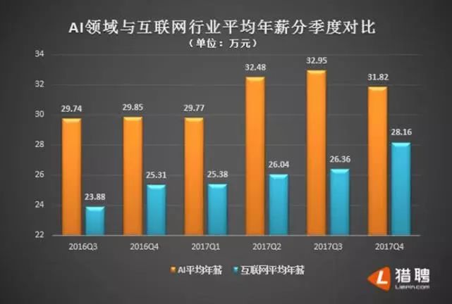 猎聘网联合 GMIC 发布了《 2018 AI 人才竞争力报告》:AI 领域从业者平均薪资高于互联网行业平均薪资,最高季度平均年薪达 33 万元,高出互联网平均年薪近 5 万元,荣登薪酬排行榜第一。