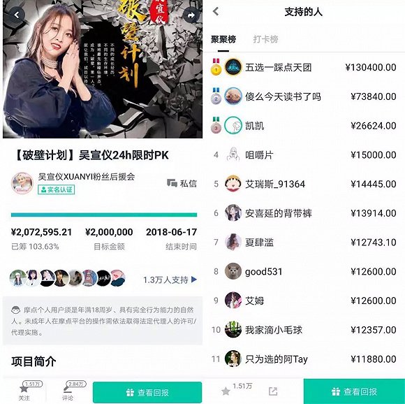 同时,每个集资项目还可以看到具体集资金额和集资排名,以刺激更多的粉丝参与。